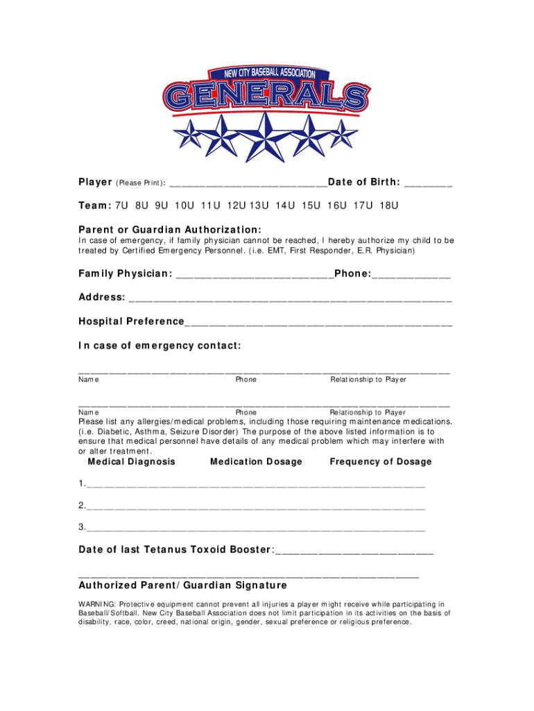 Player(Please Print):___Date of Birth: ___Team: 7U 8U 9U 10U 11U 12U 13U 14U 15U 16U 17U 18U Parent or Guardian Authorization: In case of emergency, if family physician cannot be reached, I hereby