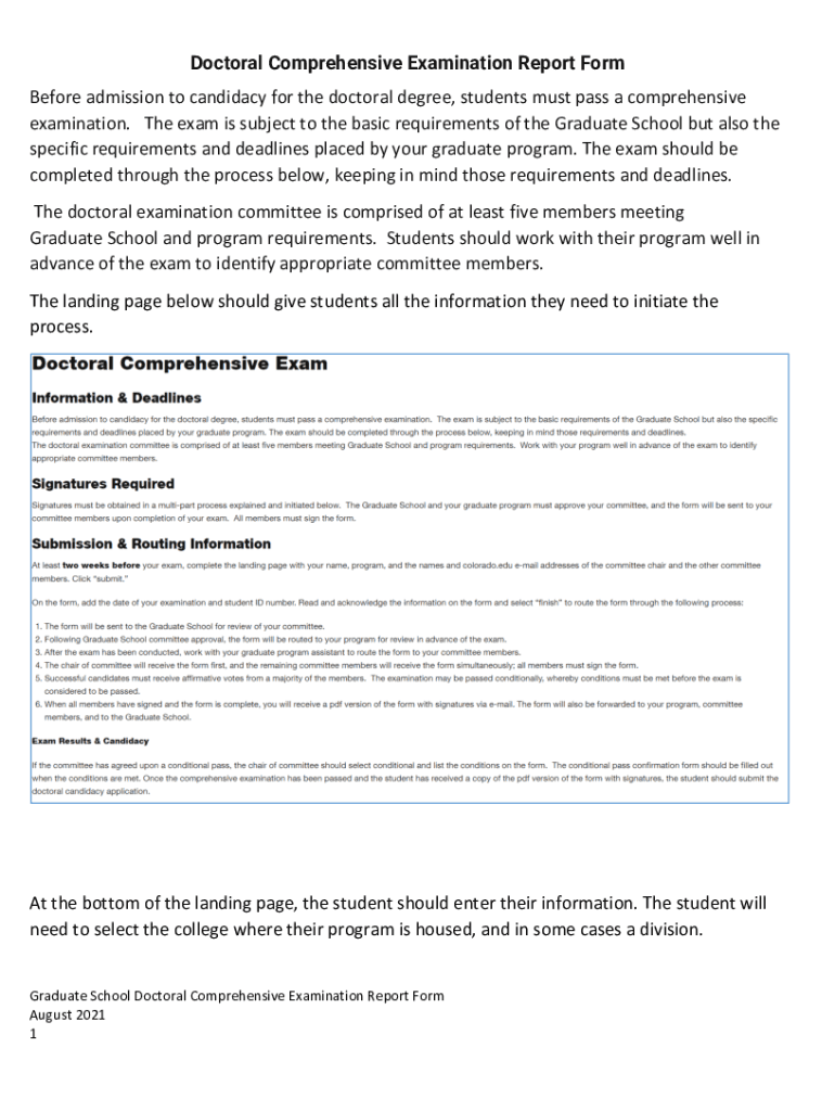 Doctoral Comprehensive Examination Report Form Before admission to candidacy for the doctoral degree, students must pass a comprehensive examination. The exam is subject to the basic requirements