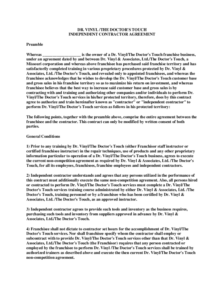 DR. VINYL /THE DOCTOR\'S TOUCH INDEPENDENT CONTRACTOR AGREEMENT Preamble Whereas ___ is the owner of a Dr. Vinyl/The Doctor\'s Touch franchise business, under an agreement dated by and between Dr.