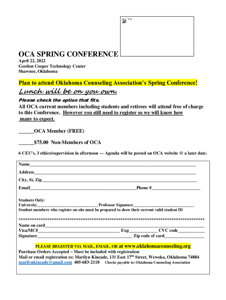 OCT SPRING CONFERENCE April 22, 2022, Gordon Cooper Technology Center Shawnee, Oklahoman to attend Oklahoma Counseling Associations Spring Conference! Lunch will be on you own. Please check the option