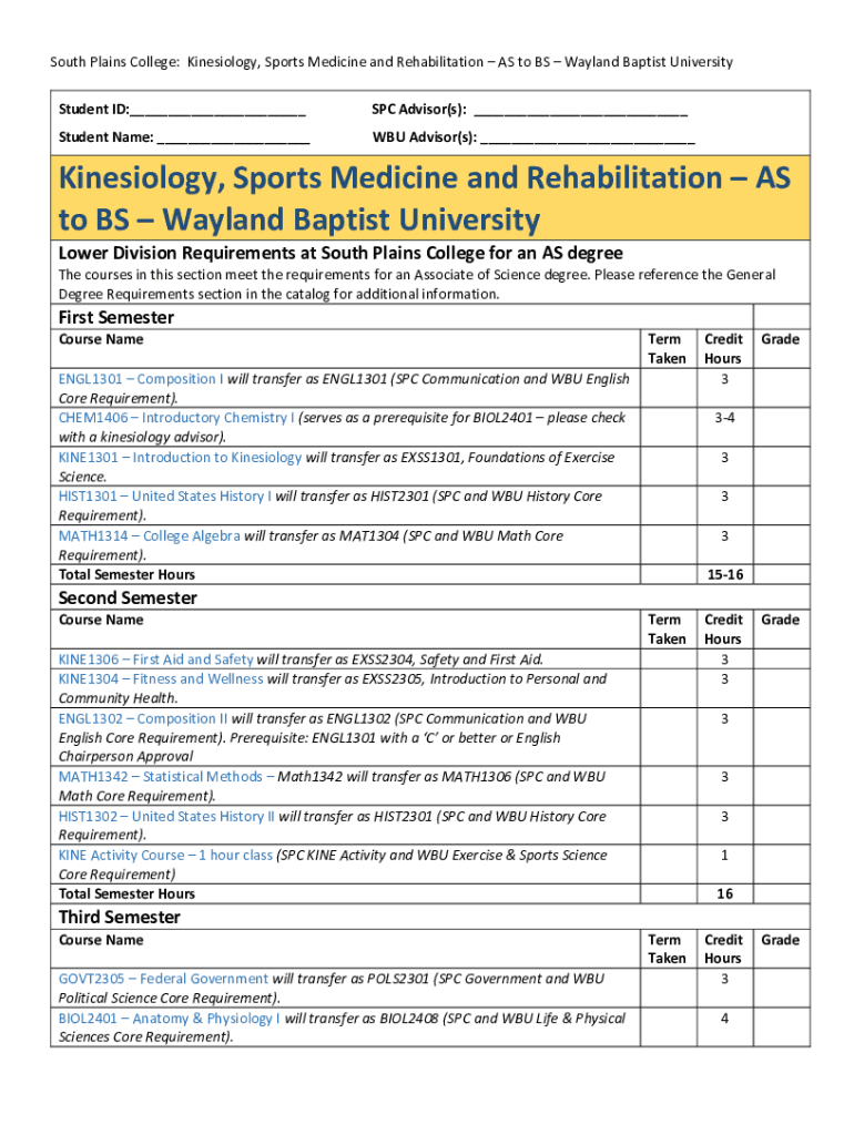 South Plains College: Kinesiology, Sports Medicine and Rehabilitation AS to BS Wayland Baptist University Student ID:___SPC Advisor(s): ___Student Name: ___WSU Advisor(s): ___Kinesiology, Sports Medicine