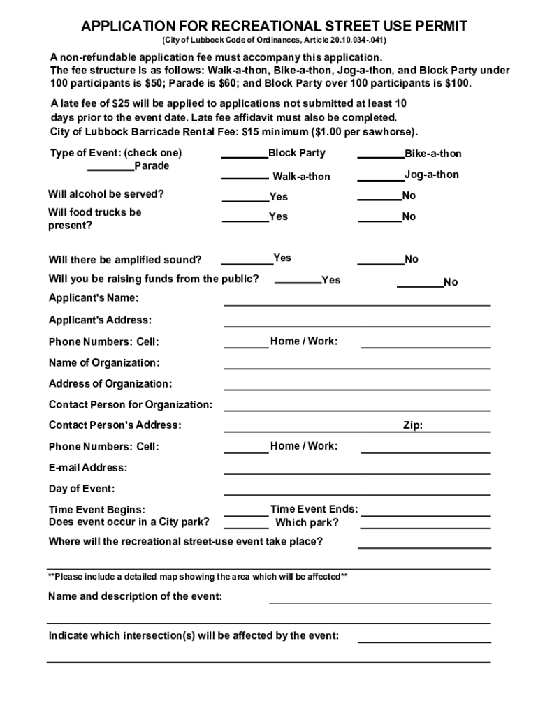 APPLICATION FOR RECREATIONAL STREET USE PERMIT (City of Lubbock Code of Ordinances, Article 20.10.034.041)A nonrefundable application fee must accompany this application. The fee structure is as follows: