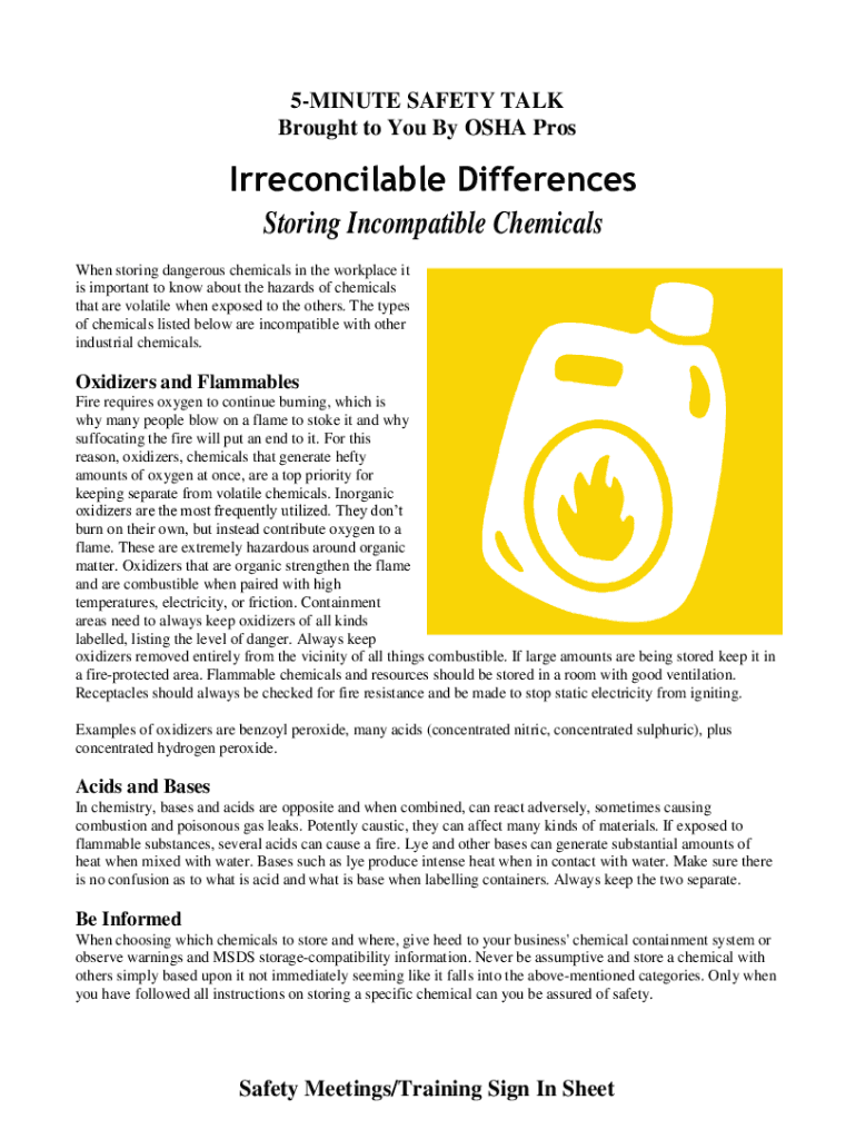 5MINUTE SAFETY TALK Brought to You By OSHA ProsIrreconcilable Differences Storing Incompatible Chemicals When storing dangerous chemicals in the workplace it is important to know about the hazards