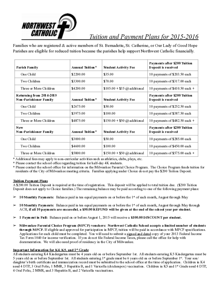 Tuition and Payment Plans for 20152016 ! Families who are registered & active members of St. Bernadette, St. Catherine, or Our Lady of Good Hope Parishes are eligible for reduced tuition because the