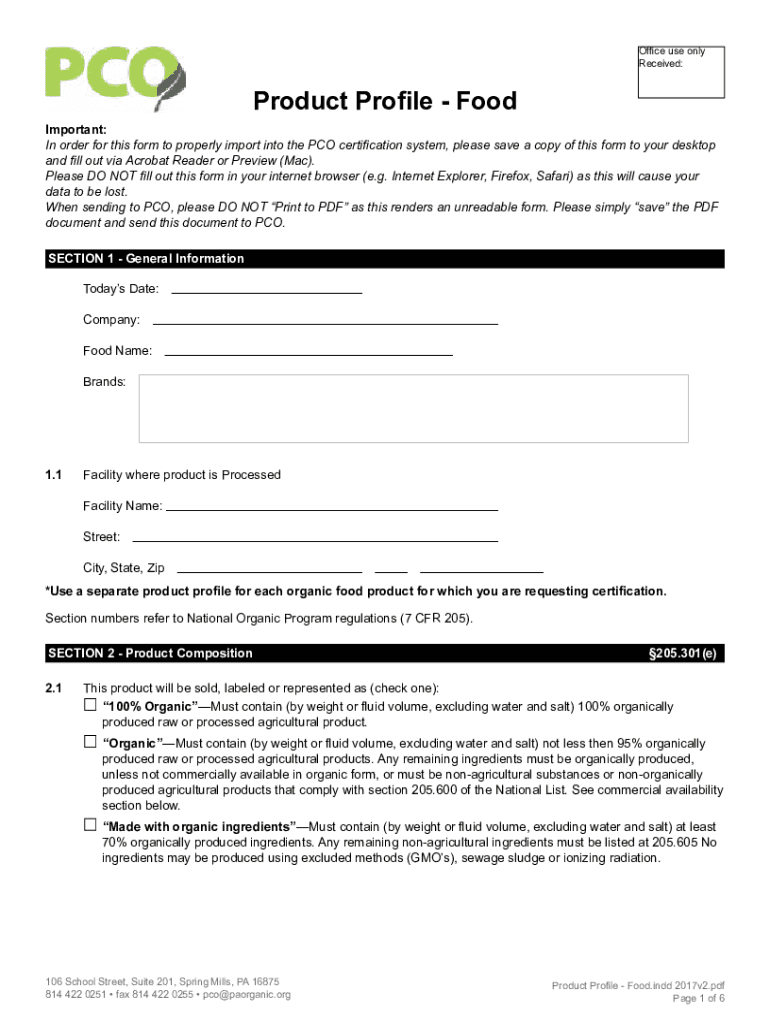 Office uses only Received:Product Profile Food Important: In order for this form to properly import into the PRO certification system, please save a copy of this form to your desktop and fill out