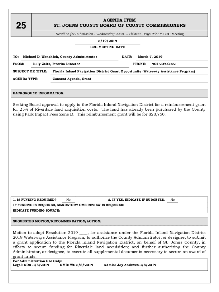 AGENDA ITEM ST. JOHNS COUNTY BOARD OF COUNTY COMMISSIONERS25Deadline for Submission Wednesday 9 a.m. Thirteen Days Prior to BCC Meeting 3/19/2019 BCC MEETING DATE TO:Michael D. Wan chick, County AdministratorFROM:DATE:Billy