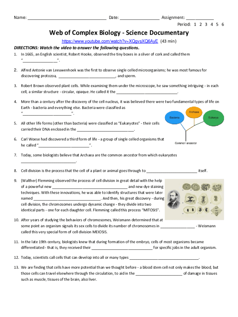 Name: ___ Date: ___ Assignment: ___ Period: 1 2 3 4 5 6Web of Complex Biology Science Documentary https://www.youtube.com/watch?vXQgvsXQ6AyE (43 min)DIRECTIONS: Watch the video to answer the following