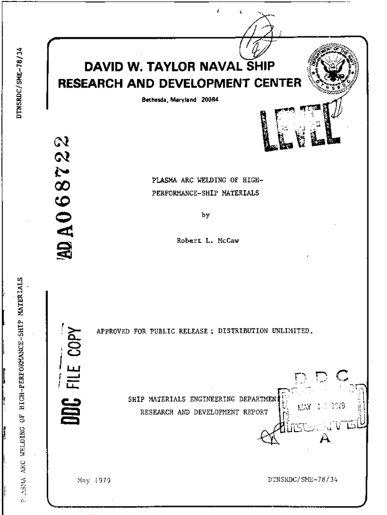 DAVID W. TAYLOR NAVAL SHIP RESEARCH AND DEVELOPMENT CENTER Bethesda, Maryland 20084PLASMA ARC WELDING OF HIGHSPERFORMANCESHIP MATERIALS0byRobert L. McCaw41APPROVED FOR PUBLIC RELEASE; DISTRIBUTION