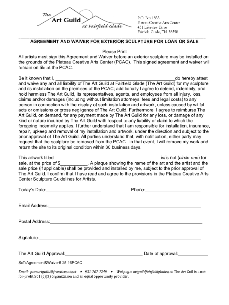 Get the free Agreement and Waiver for exterior sculpture for loan or sale