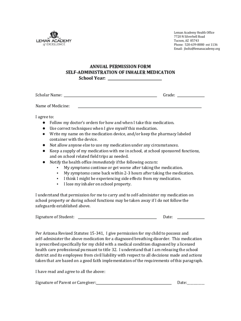 ANNUAL PERMISSION FORM MALADMINISTRATION OF INHALER MEDICATION School Year: ___Scholar Name: ___ Name of Medicine:Grade: ______I agree to: Follow my doctors orders for how and when I take this medication.