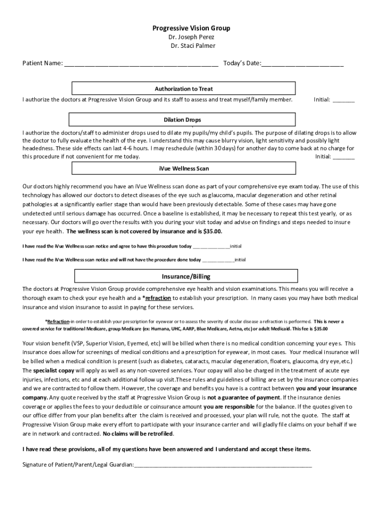 Progressive Vision Group Dr. Joseph Perez Dr. Staci Palmer Patient Name: ___ Today's Date:___Authorization to Treat I authorize the doctors at Progressive Vision Group and its staff to assess and
