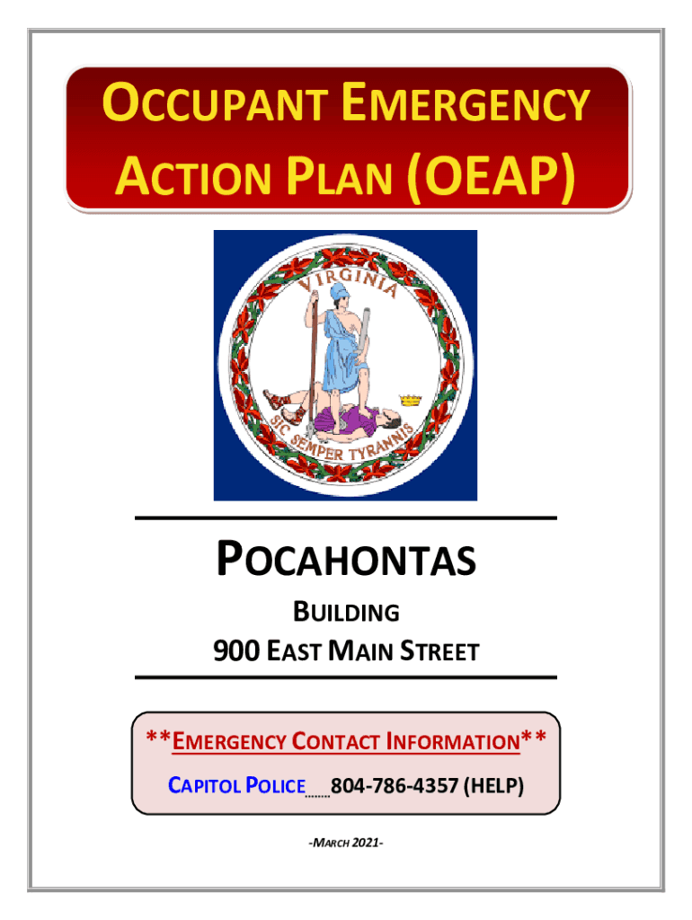 OCCUPANT EMERGENCY ACTION PLAN (LEAP)POCAHONTAS BUILDING 900 EAST MAIN STREET **EMERGENCY CONTACT INFORMATION** CAPITOL POLICE8047864357 (HELP) MARCH 2021TABLE OF CONTENTS (HYPERLINKED) PURPOSE2 SCOPE2