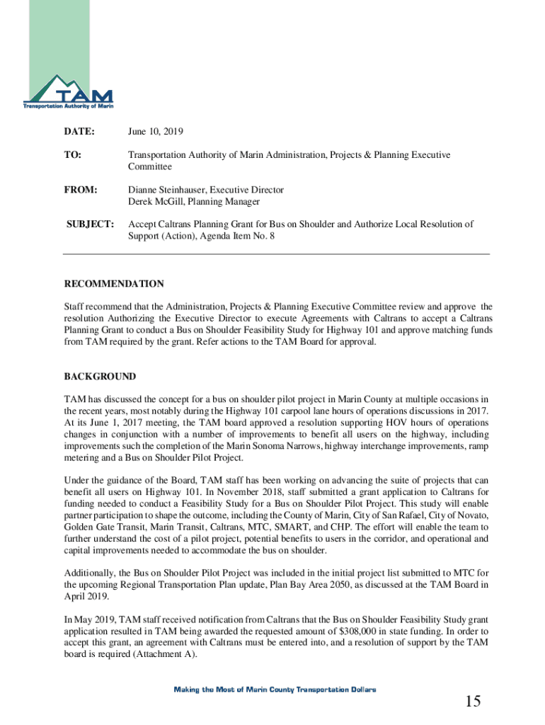 DATE:June 10, 2019TO:Transportation Authority of Marin Administration, Projects & Planning Executive CommitteeFROM:Dianne Tannhauser, Executive Director Derek McGill, Planning ManagerSUBJECT:Accept