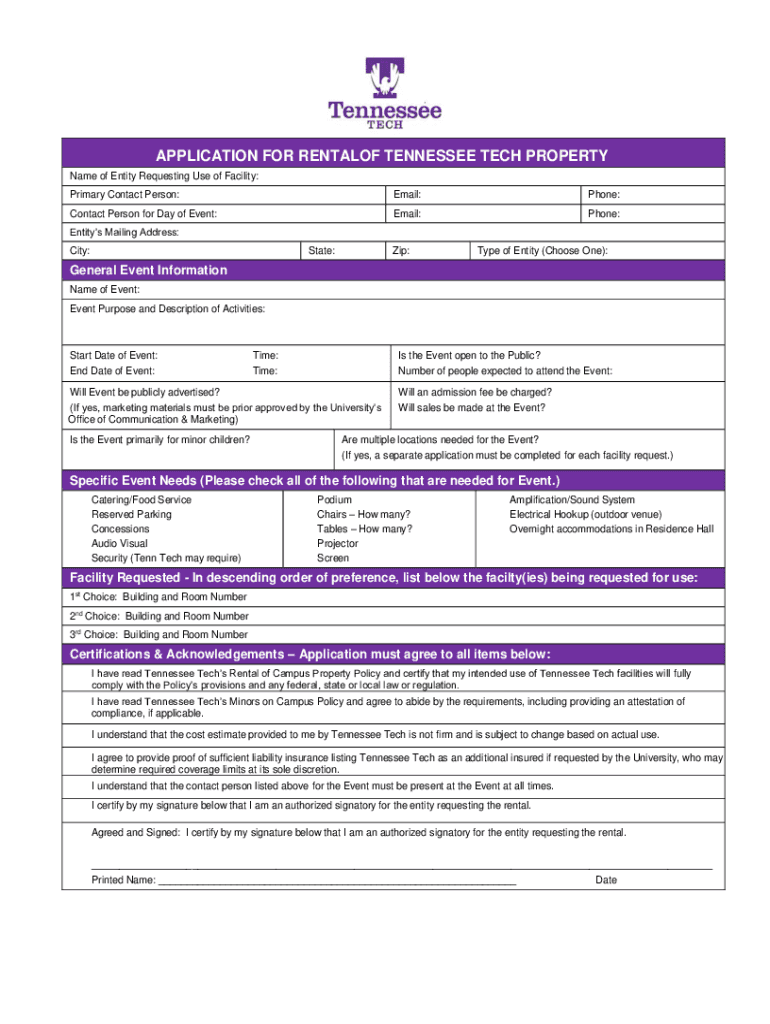 APPLICATION FOR RENTAL TENNESSEE TECH PROPERTY Name of Entity Requesting Use of Facility: Primary Contact Person:Email:Phone:Contact Person for Day of Event:Email:Phone:Entities Mailing Address: City:State:Zip:Type