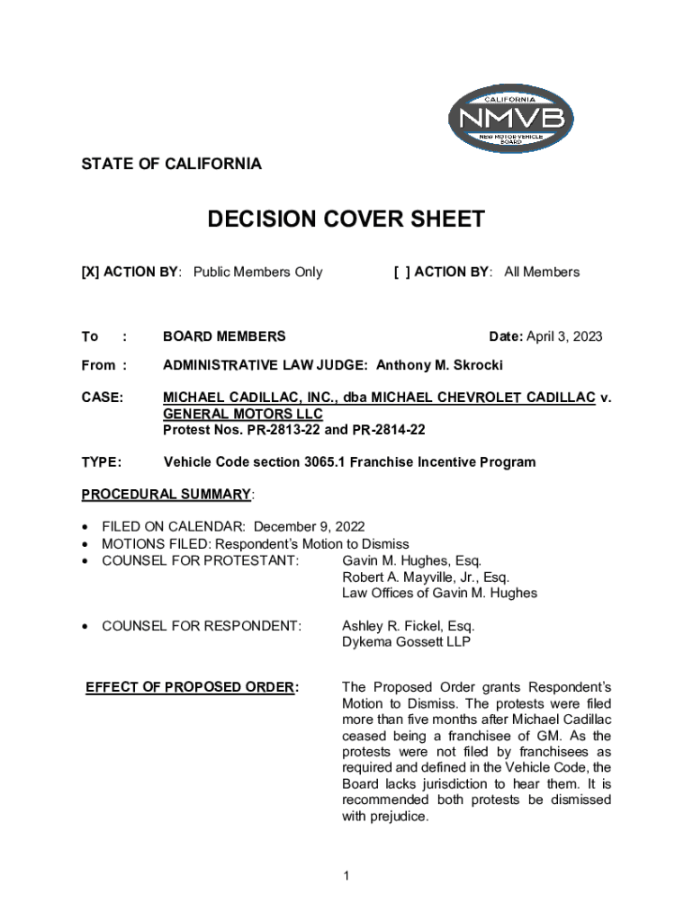 [X] ACTION BY: Public Members Only:[ ] ACTION BY: All MembersBOARD MEMBERSDate: April 3, 2023From :ADMINISTRATIVE LAW JUDGE: Anthony M. SkrockiCASE:MICHAEL