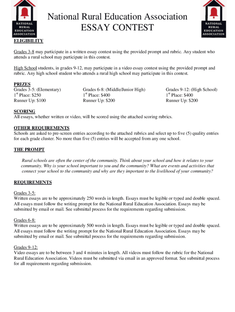 National Rural Education Association ESSAY CONTEST ELIGIBILITY Grades 38 may participate in a written essay contest using the provided prompt and rubric. Any student who attends a rural school may