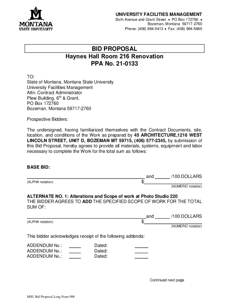 UNIVERSITY FACILITIES MANAGEMENT Sixth Avenue and Grant Street PO Box 172760 Bozeman, Montana 597172760 Phone: (406) 9945413 Fax: (406) 9945665BID PROPOSAL Haynes Hall Room 216 Renovation PPA No.
