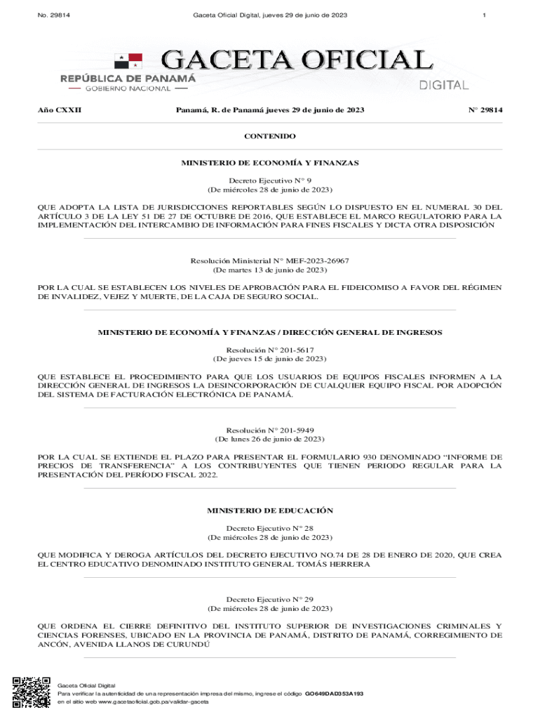 No. 29814Ao CXXIIGaceta Official Digital, Jeeves 29 DE junior de 20231Panam, R. de Panama Jeeves 29 DE junior DE 2023 N 29814CONTENIDOMINISTERIO DE ECONOMY Y FINANCES Secret Executive N 9 (DE circles