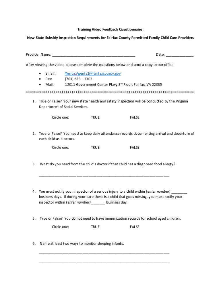 Training Video Feedback Questionnaire: New State Subsidy Inspection Requirements for Fairfax County Permitted Family Child Care ProvidersProvider Name: ___Date: ___After viewing the video, please