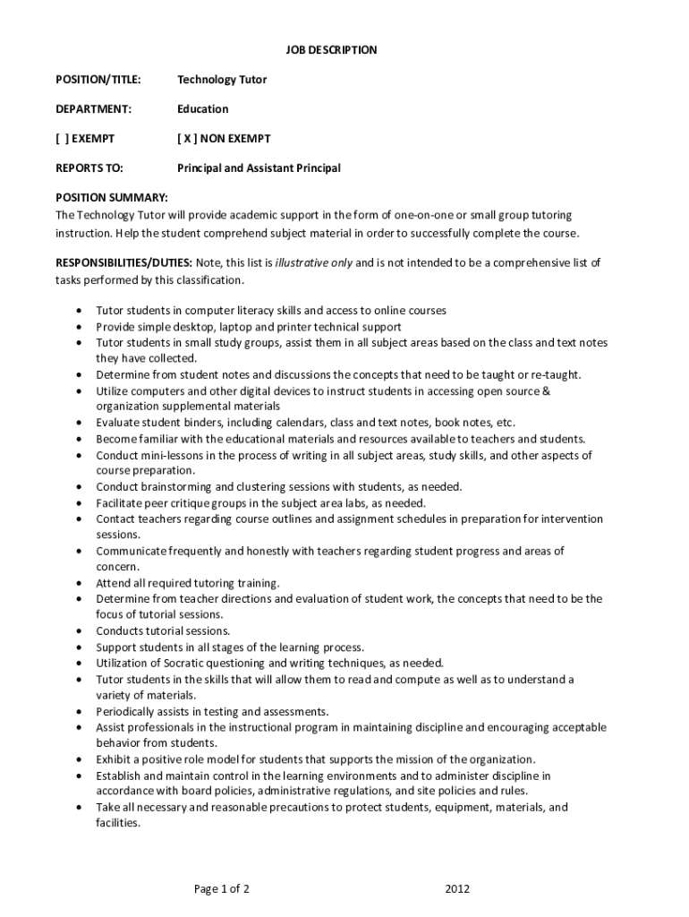 POSITION/TITLE:Technology TutorDEPARTMENT:Education[ ] EXEMPT[X] NON EXEMPTREPORTS TO:Principal and Assistant PrincipalPOSITION SUMMARY: