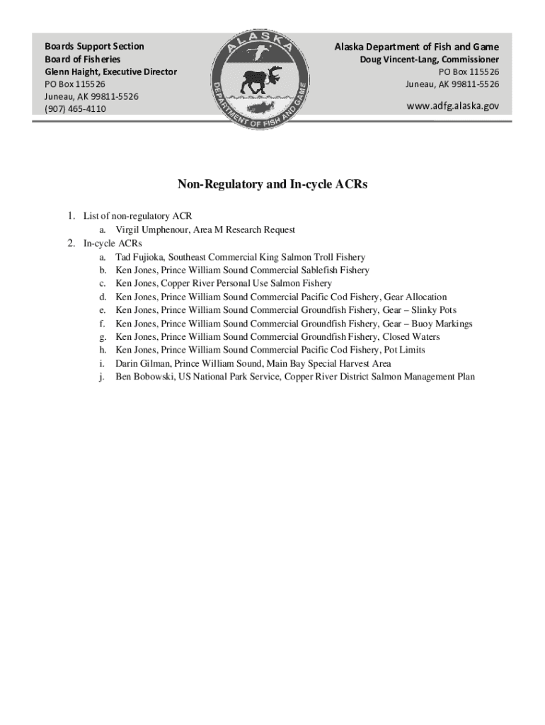 Alaska Department of Fish and Baseboards Support Section Board of Fisheries Glenn Height, Executive Director PO Box 115526 Juneau, AK 998115526 (907) 4654110Doug Vincent Lang, Commissioner PO Box