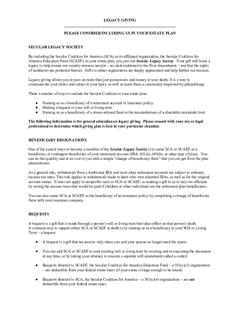 LEGACY GIVING ___ PLEASE CONSIDER INCLUDING US IN YOUR ESTATE PLAN SECULAR LEGACY SOCIETY By including the Secular Coalition for America (SCA) or its affiliated organization, the Secular Coalition