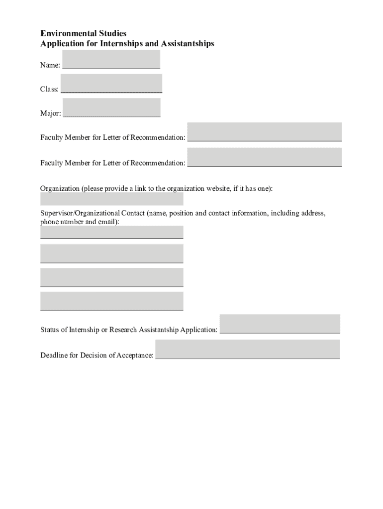 Environmental Studies Application for Internships and Assistant ships Name: Class: Major: Faculty Member for Letter of Recommendation: Faculty Member for Letter of Recommendation: Organization (please