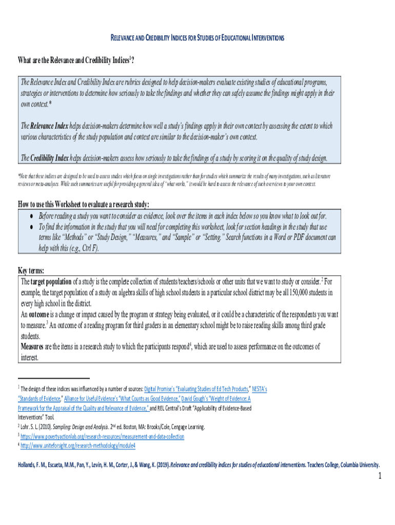 RELEVANCE AND CREDIBILITY INDICES FOR STUDIES OF EDUCATIONAL INTERVENTIONS What are the Relevance and Credibility Indices 1? The Relevance Index and Credibility Index are rubrics designed to help