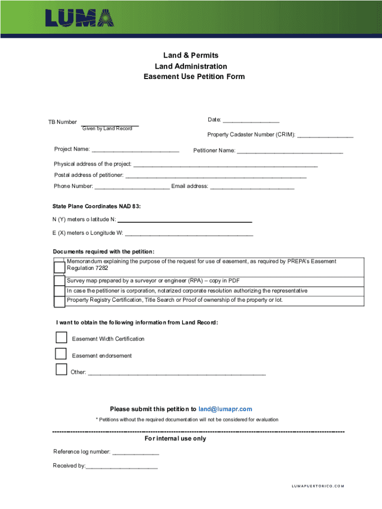 Land & Permits Land Administration Easement Use Petition Form TB Numerate: ___ Given by Land RecordProperty Cad aster Number (CRIM): ___Project Name: ___Petitioner Name: ___Physical address of the