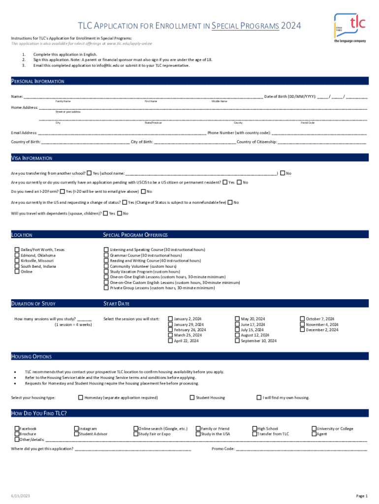 TLC APPLICATION FOR ENROLLMENT IN SPECIAL PROGRAMS 2024 Instructions for TLC's Application for Enrollment in Special Programs: This application is also available for select offerings at www.tlc.edu/applyonline