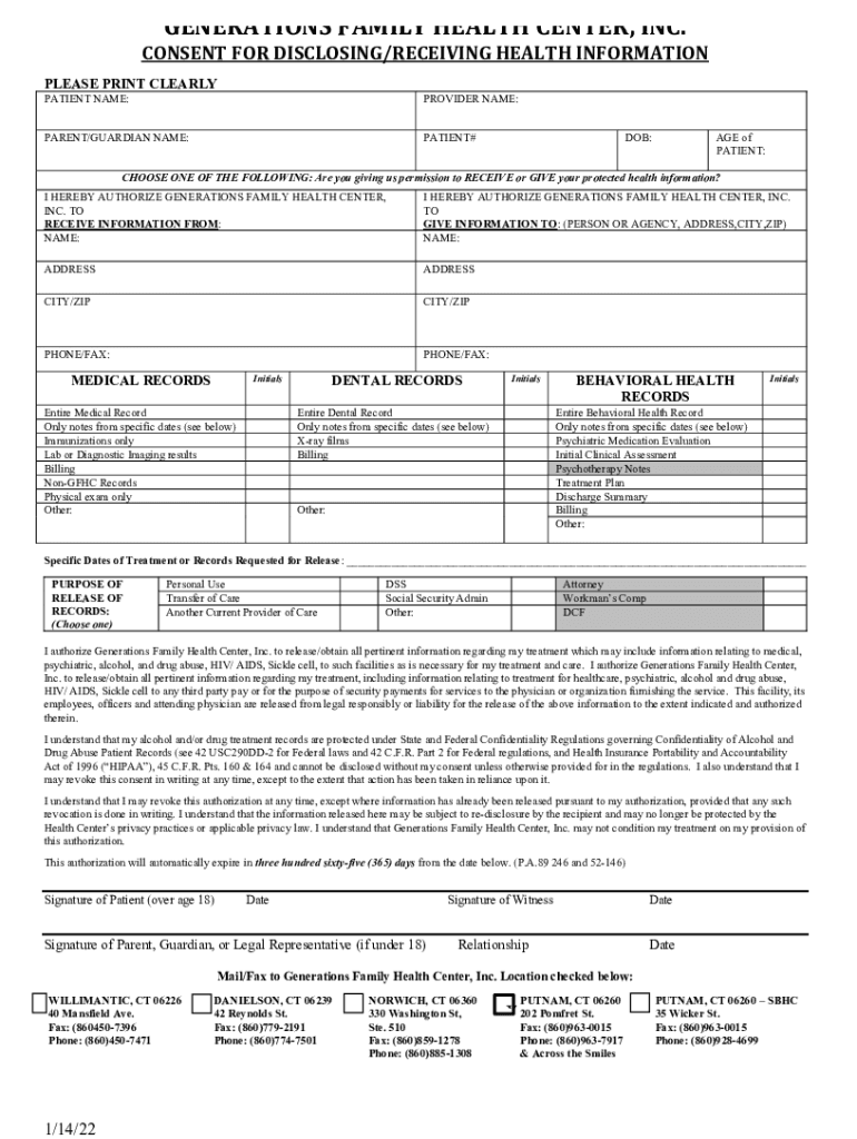 GENERATIONS FAMILY HEALTH CENTER, INC.CONSENT FOR DISCLOSING/RECEIVING HEALTH INFORMATIONPLEASE PRINT CLEARLY PATIENT NAME:PROVIDER NAME:PARENT/GUARDIAN NAME:PATIENT#DOB:AGE of PATIENT:CHOOSE ONE