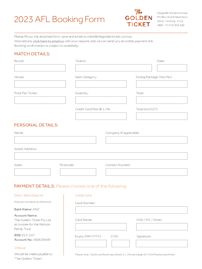 Thegoldenticket.com.AU PO Box 6109 Hawthorn West, Victoria, 3122 ABN: 73 578 308 4822023 AFL Booking Form Please fill out the attached form, save and email to mike@thegoldenticket.com.au Alternatively
