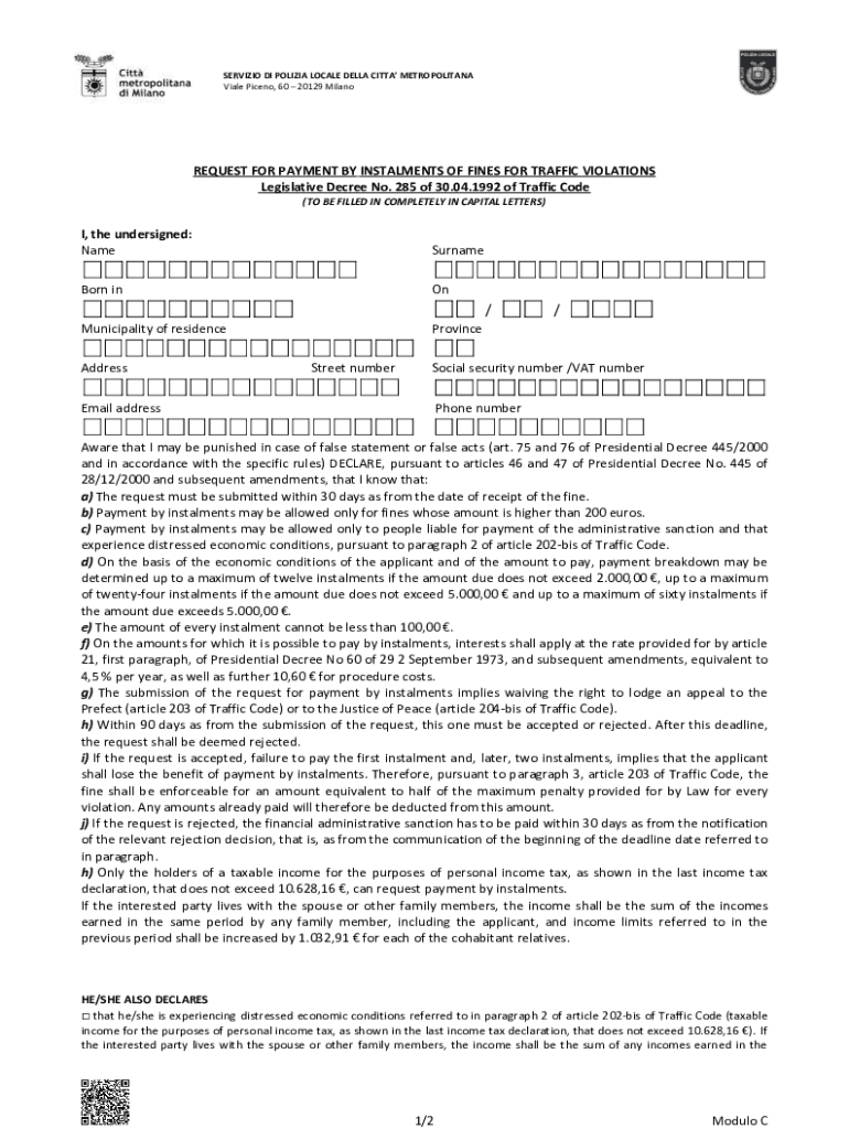 Viable Piano, 60 20129 MilanoREQUEST FOR PAYMENT BY Installments OF FINES FOR TRAFFIC VIOLATIONS
