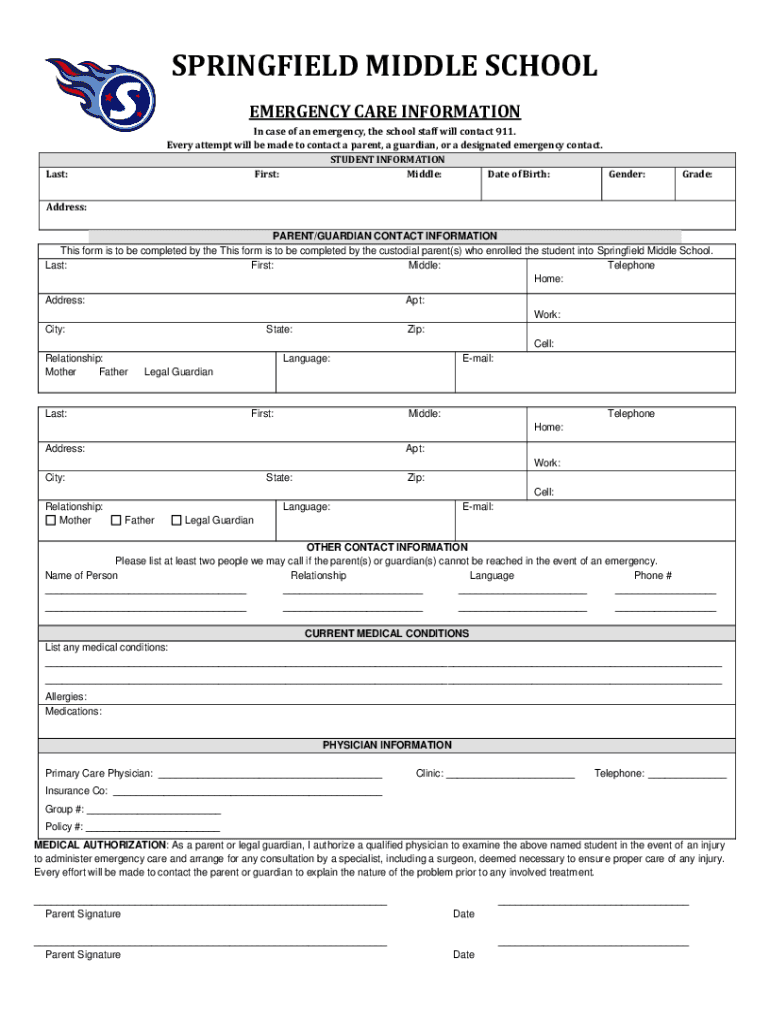 SPRINGFIELD MIDDLE SCHOOL EMERGENCY CARE INFORMATION In case of an emergency, the school staff will contact 911. Every attempt will be made to contact a parent, a guardian, or a designated emergency