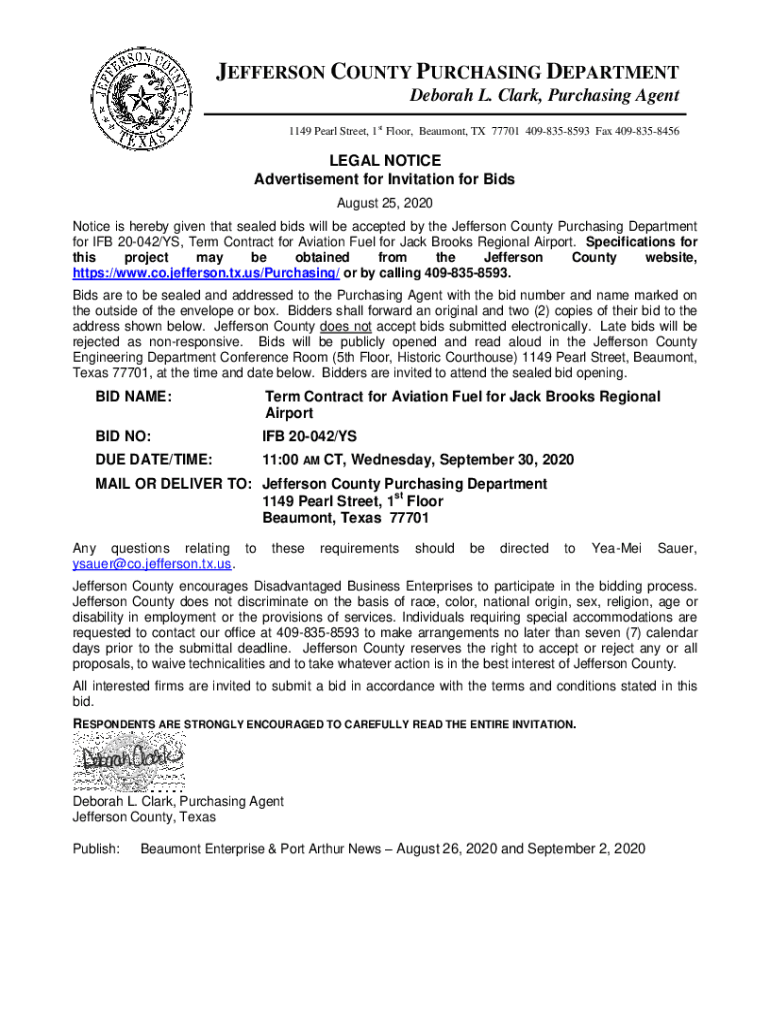JEFFERSON COUNTY PURCHASING DEPARTMENT Deborah L. Clark, Purchasing Agent 1149 Pearl Street, 1st Floor, Beaumont, TX 77701 4098358593 Fax 4098358456LEGAL NOTICE Advertisement for Invitation for Bids