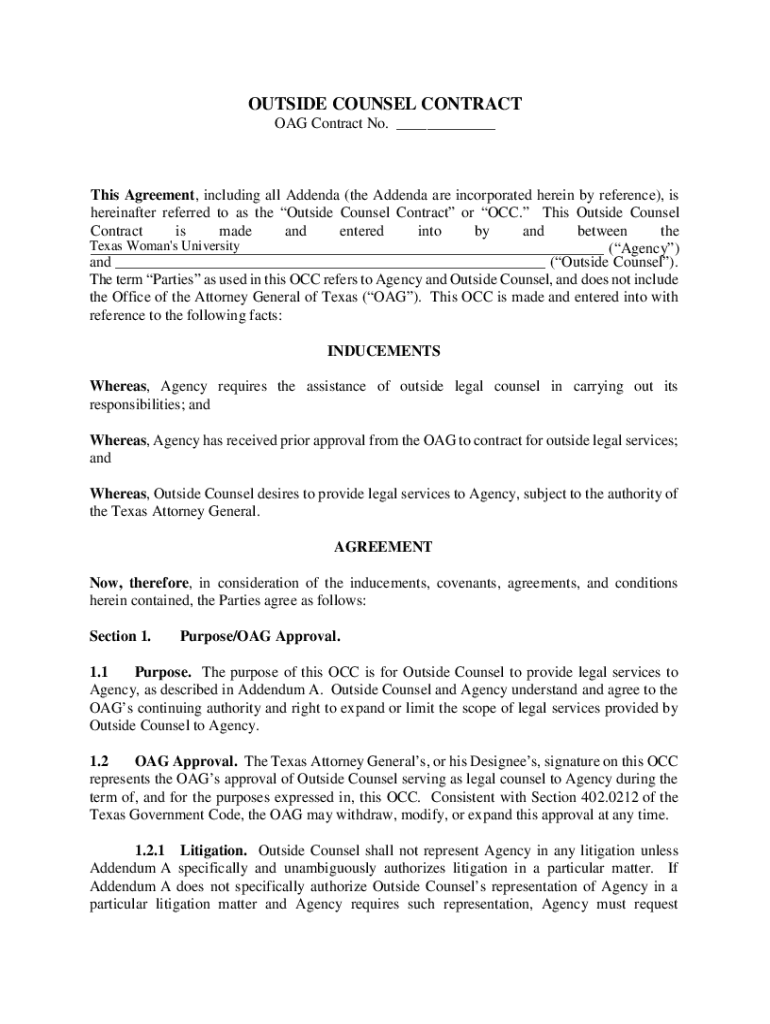 OUTSIDE COUNSEL CONTRACT TAG Contract No. ___This Agreement, including all Addenda (the Addenda are incorporated herein by reference), is hereinafter referred to as the Outside Counsel Contract or