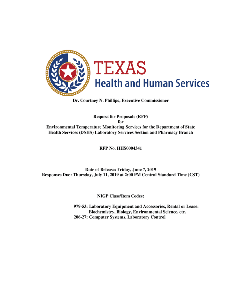 Dr. Courtney N. Phillips, Executive CommissionerRequest for Proposals (RFP) for Environmental Temperature Monitoring Services for the Department of State Health Services (DSS) Laboratory Services