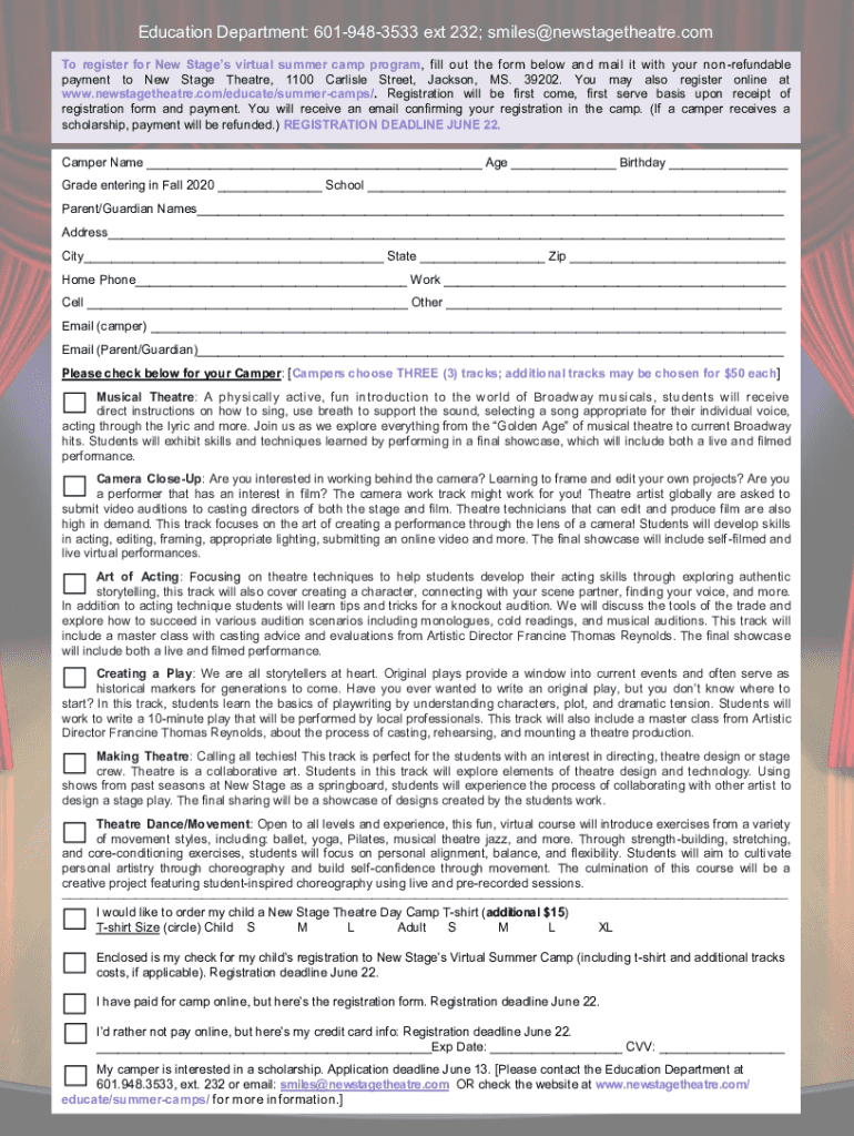 Education Department: 6019483533 ext 232; smiles@newstagetheatre.com To register for New Stages virtual summer camp program, fill out the form below and mail it with your non-refundable payment to