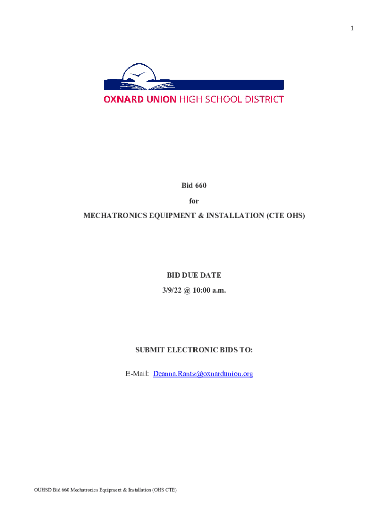 1Bid 660 for MECHATRONICS EQUIPMENT & INSTALLATION (CTE OHS)BID DUE DATE 3/9/22 @ 10:00 a.m.SUBMIT ELECTRONIC BIDS TO: Email: Deanna.Rantz@oxnardunion.orgOUHSD Bid 660 Mechatronics Equipment & Installation