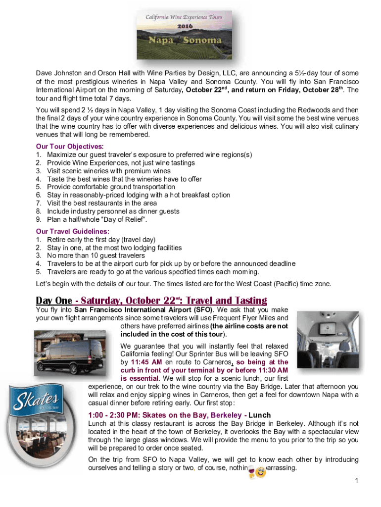 Dave Johnston and Orson Hall with Wine Parties by Design, LLC, are announcing a 5day tour of some of the most prestigious wineries in Napa Valley and Sonoma County. You will fly into San Francisco