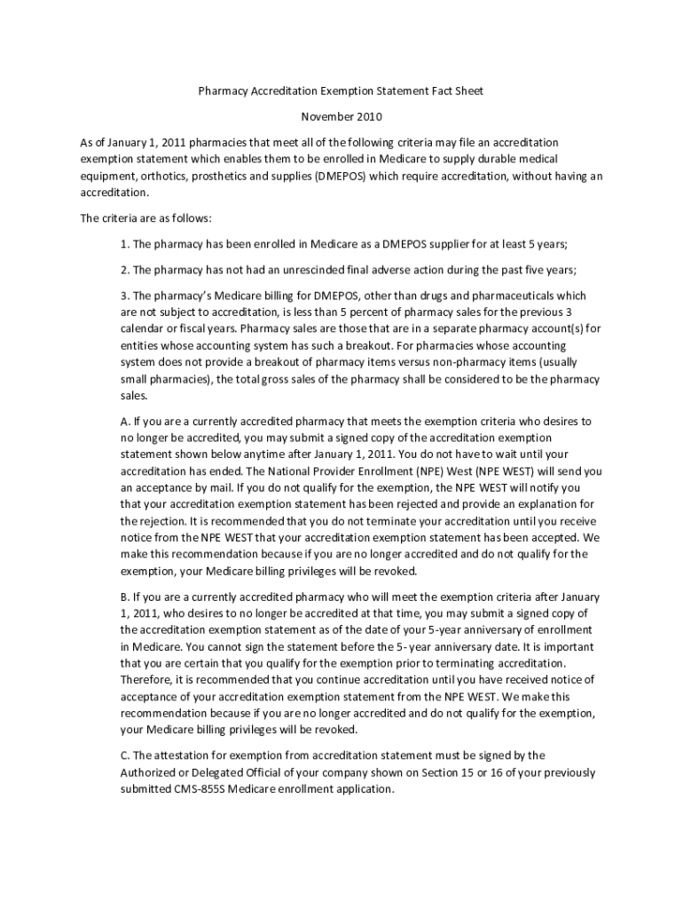 Pharmacy Accreditation Exemption Statement Fact Sheet November 2010 As of January 1, 2011, pharmacies that meet all the following criteria may file an accreditation exemption statement which enables