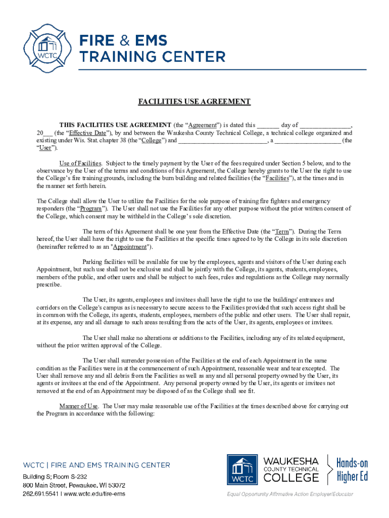 FACILITIES USE AGREEMENT THIS FACILITIES USE AGREEMENT (the Agreement) is dated this ___ day of ___, 20___ (the Effective Date), by and between the Waukesha County Technical College, a technical college