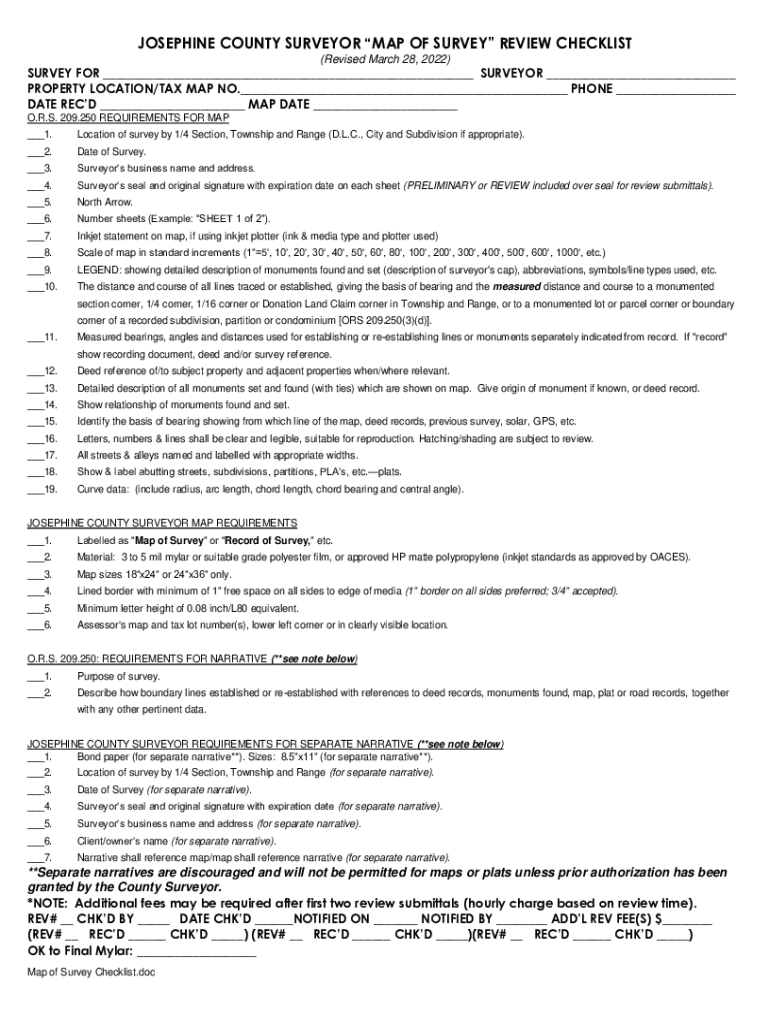 JOSEPHINE COUNTY SURVEYOR MAP OF SURVEY REVIEW CHECKLIST (Revised March 28, 2022)SURVEY FOR ___ SURVEYOR ___ PROPERTY LOCATION/TAX MAP NO.___ PHONE ___ DATE RECD ___ MAP DATE ___ O.R.S. 209.250 REQUIREMENTS