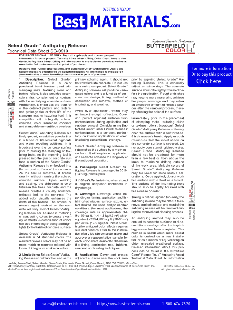 DISTRIBUTED BYS elect Grade Antiquing Release Technical Data Sheet SG0910Engineered Concrete PerformanceBUTTERFIELD COLORFUL PROFESSIONAL USE ONLY. Read all applicable and current product information