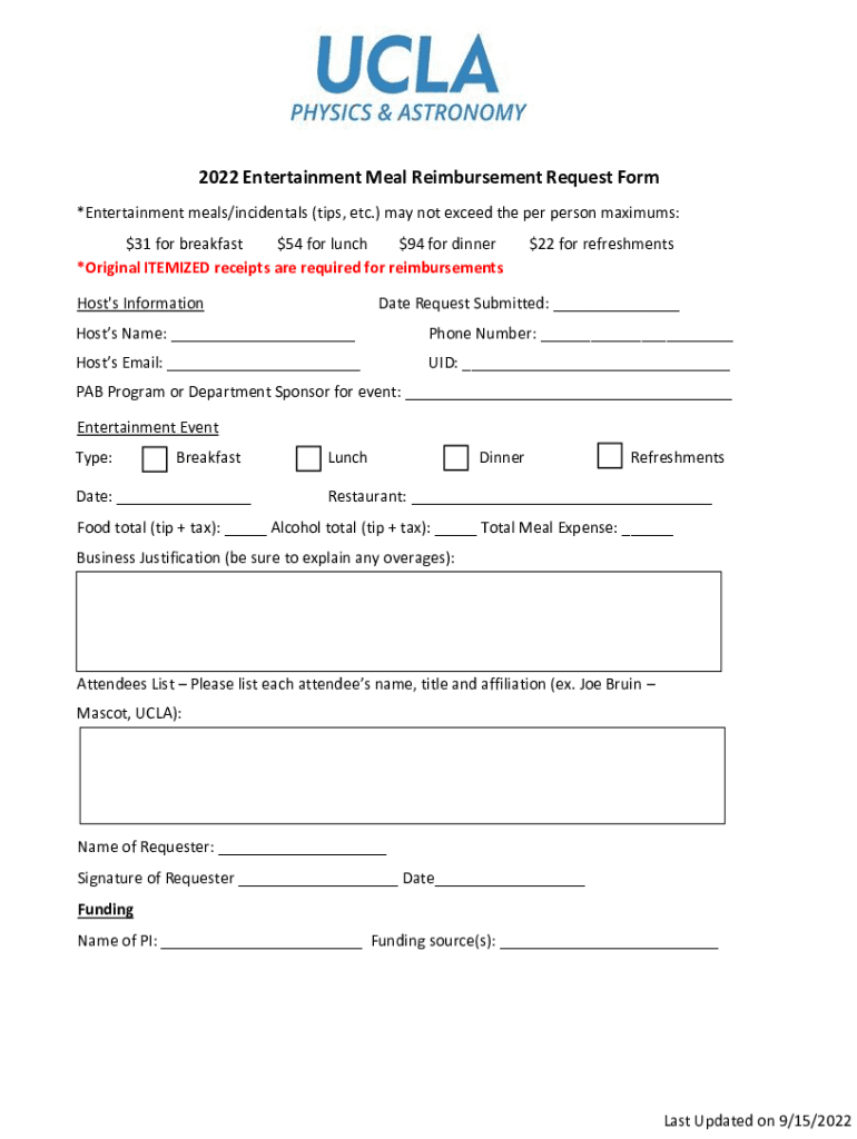 Obtain the 2022 entertainment meal reimbursement form from the designated department.
