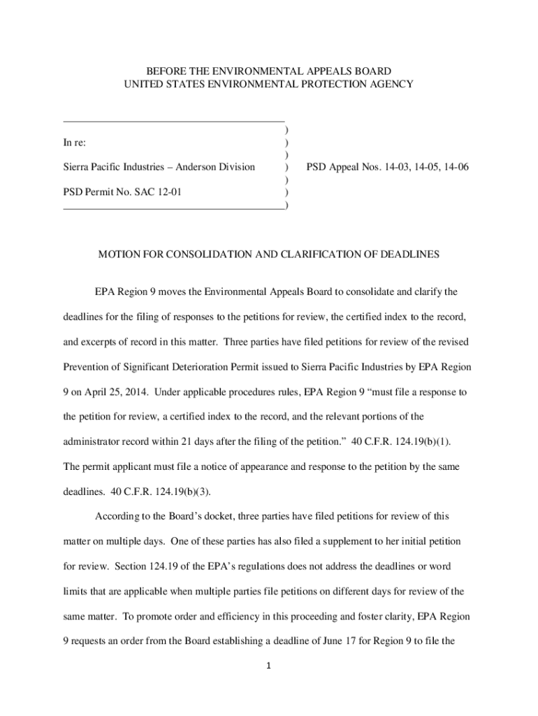 BEFORE THE ENVIRONMENTAL APPEALS BOARD UNITED STATES ENVIRONMENTAL PROTECTION AGENCY ___) In re:)) Sierra Pacific Industries Anderson Division)) PSD Permit No. SAC 1201) ___)PSD Appeal Nos. 1403,