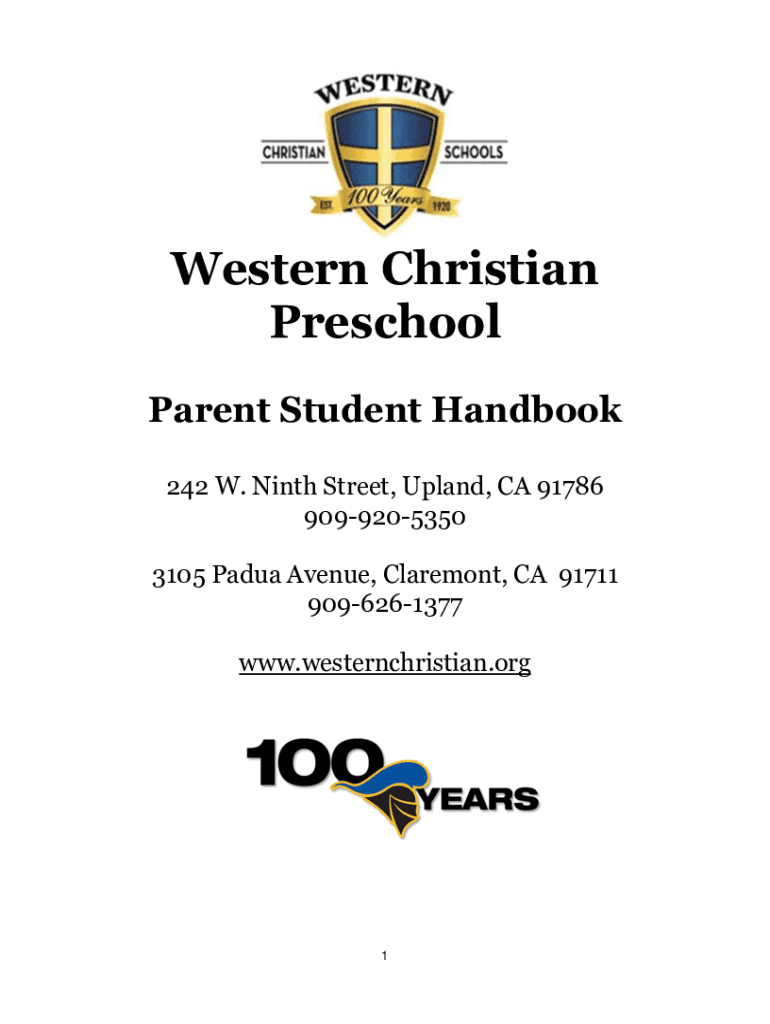 Western Christian Preschool Parent Student Handbook 242 W. Ninth Street, Upland, CA 91786 9099205350 3105 Padua Avenue, Claremont, CA 91711 9096261377 www.westernchristian.org1TABLE OF CONTENTS WESTERN
