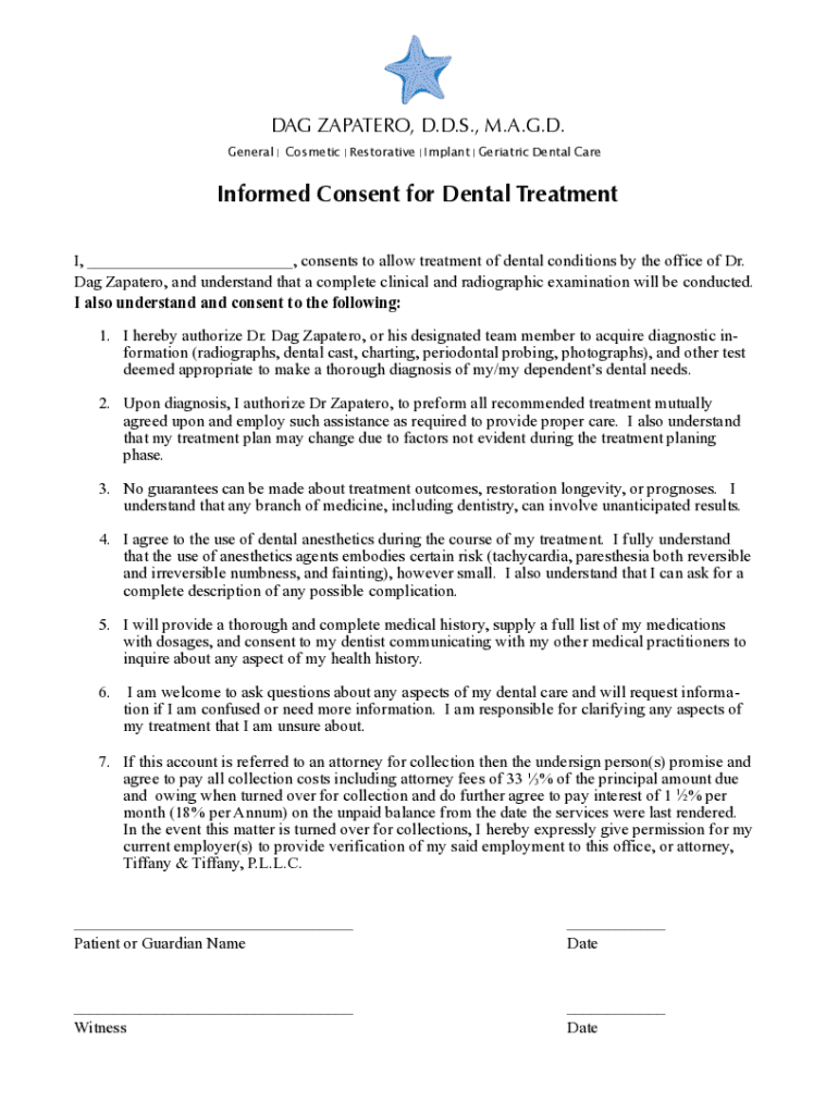 DAG ZÁPARO, D.D.S., M.A.G.D. General | Cosmetic | Restorative | Implant | Geriatric Dental Reinformed Consent for Dental Treatment I, ___, consents to allow treatment of dental conditions by the