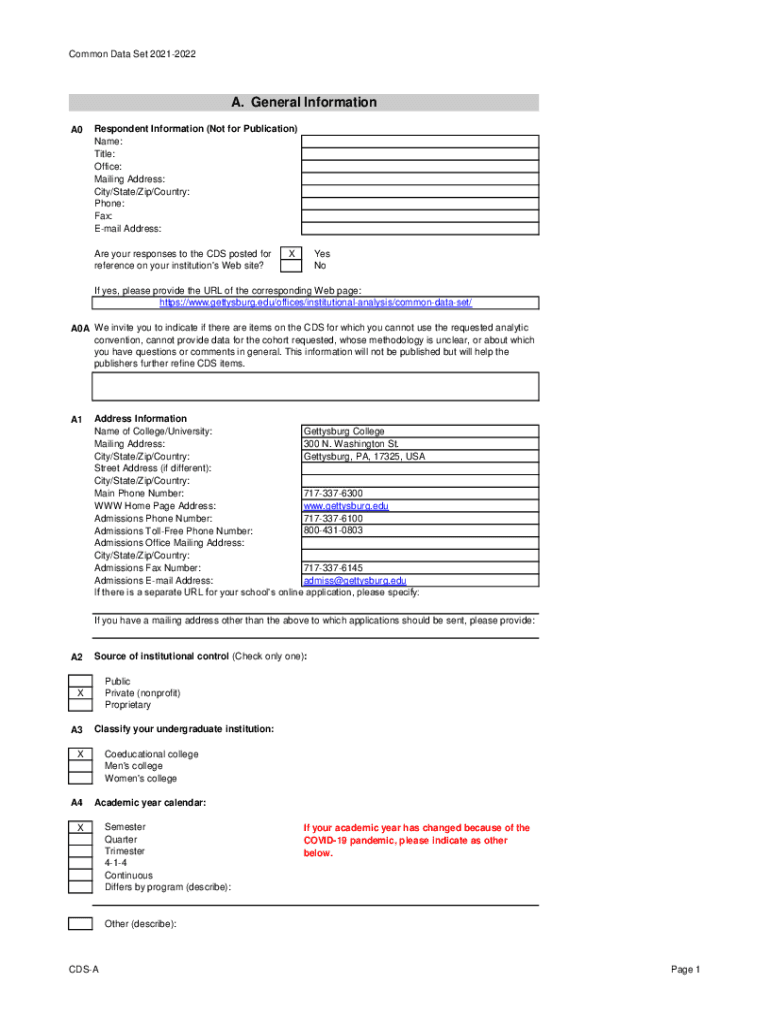Common Data Set 20212022A. General Information A0Respondent Information (Not for Publication) Name: Title: Office: Mailing Address: City/State/Zip/Country: Phone: Fax: Email Address: Are your responses