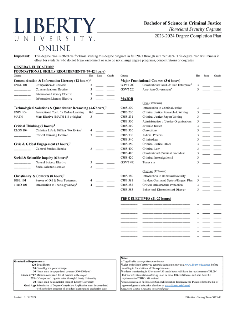 Bachelor of Science in Criminal Justice Homeland Security Cognate 20232024 Degree Completion Unimportant:This degree plan is effective for those starting this degree program in fall 2023 through summer